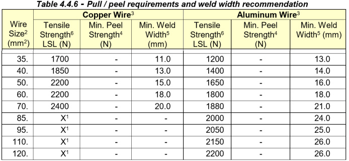 電池的正極材料為鋁,所以檢測線基本為銅線焊接到鋁片上,對于這樣的應(yīng)用可以認(rèn)為為鋁銅連接,拉力撕拉力應(yīng)參照鋁線焊接,按USCAR38-1標(biāo)準(zhǔn),0.22﹑0.35 mm2線的標(biāo)準(zhǔn)是缺失的。具體可以參照我司楚鑫sonictech的企業(yè)標(biāo)準(zhǔn)。